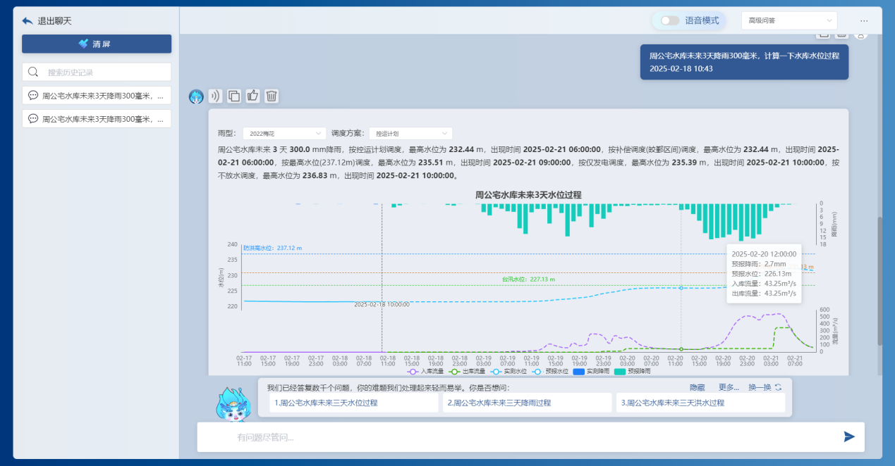 基于前端感知的降雨、水位、流量、工程運行等實時信息,借助DeepSeek大模型和“甬水院智算”算法庫,能夠實時對流域防汛形勢進行快速分析,包括降雨形勢、水情預警、預泄分析、水庫納蓄分析等,可以按照規(guī)定的表單形式一鍵輸出成果,為防汛防洪工作提供兼具前瞻性、科學性、精準性、安全性的決策支撐。相關學術成果曾以《基于大模型的水利防汛智能問答關鍵技術研究與應用探索》為題于去年8月的第七屆城市水安全與水管理學術交流會作專題匯報。