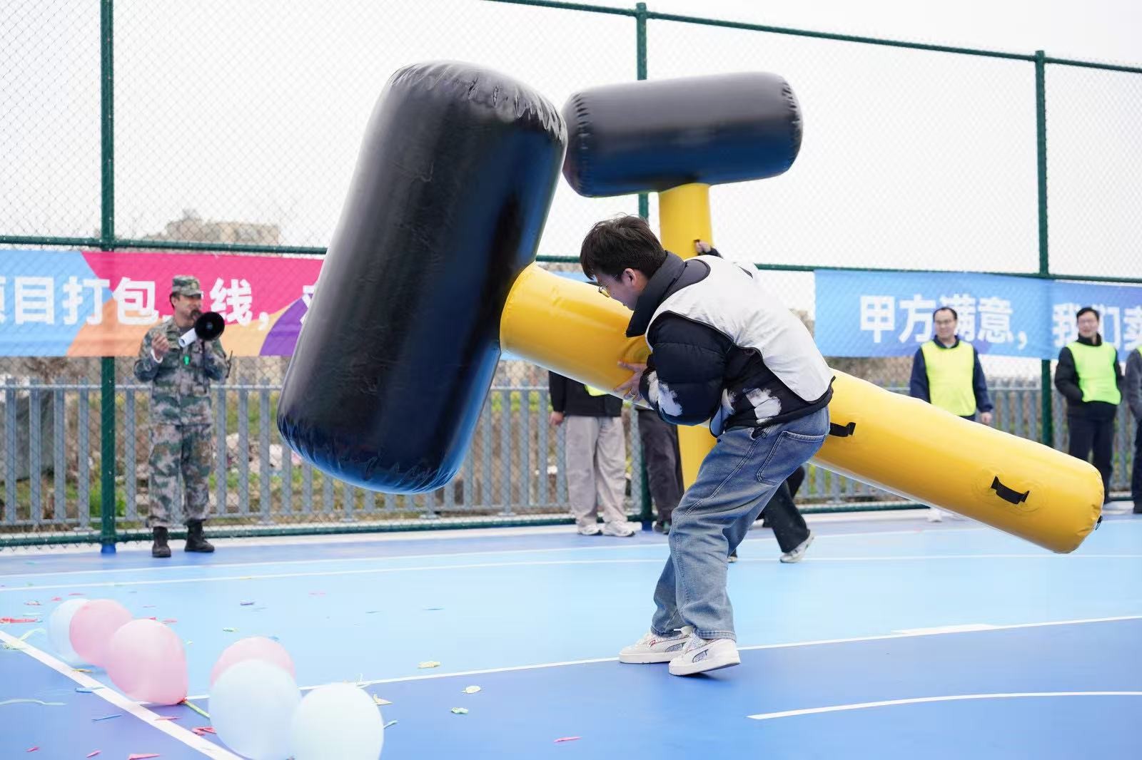 在“南水北調(diào)”項(xiàng)目中,隊(duì)員們手持PVC管接力運(yùn)水,5分鐘內(nèi)爭分奪秒,讓水流在管中傳遞涌向重點(diǎn),仿佛將團(tuán)隊(duì)的信任與責(zé)任匯聚成河。“龜兔賽跑”則讓隊(duì)員們化身可愛的“烏龜”和“兔子”,在賽道上你追我趕,妙趣橫生。“鴻運(yùn)亨通”需要8人共同托舉大球折返跑,大家步調(diào)一致,齊頭并進(jìn)。“一錘定音”環(huán)節(jié),隊(duì)員們揮動(dòng)充氣大錘敲破氣球,每一聲“砰”響都引來陣陣喝彩。