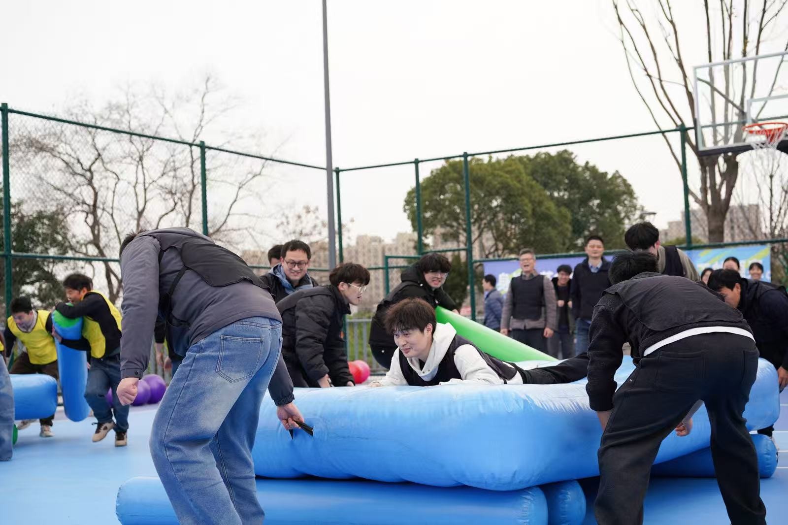 “勇立潮頭”考驗(yàn)的是反應(yīng)與穩(wěn)定,隊(duì)員們圍成圓圈快速移動(dòng),同步接住充氣柱,1分鐘內(nèi)有效移動(dòng)次數(shù)不斷刷新。“超級NBA”中,大家用瑜伽球投籃,雖姿勢各異,但進(jìn)球瞬間的歡呼同樣熱烈。“乘風(fēng)破浪”要求隊(duì)員在充氣墊上接力鋪設(shè)充氣棒,讓體重不輕于75kg的“重量級”選手穩(wěn)坐墊上,隊(duì)友們默契配合,如乘風(fēng)破浪般前行。最后的“巨人腳步”由每隊(duì)兩名領(lǐng)隊(duì)腳穿巨型鞋蹼接力奔跑,滑稽的動(dòng)作引來全場笑聲不斷。